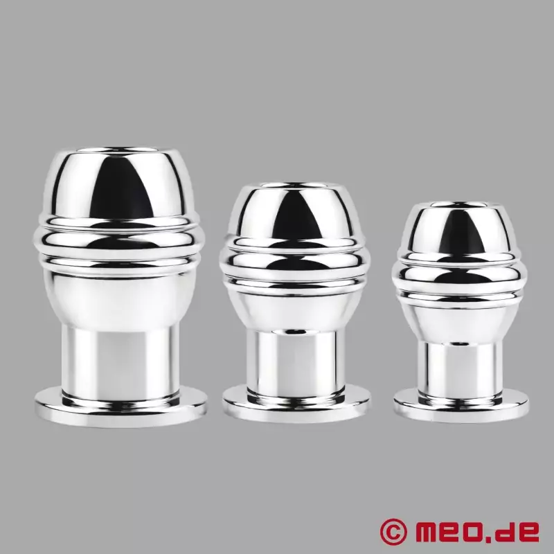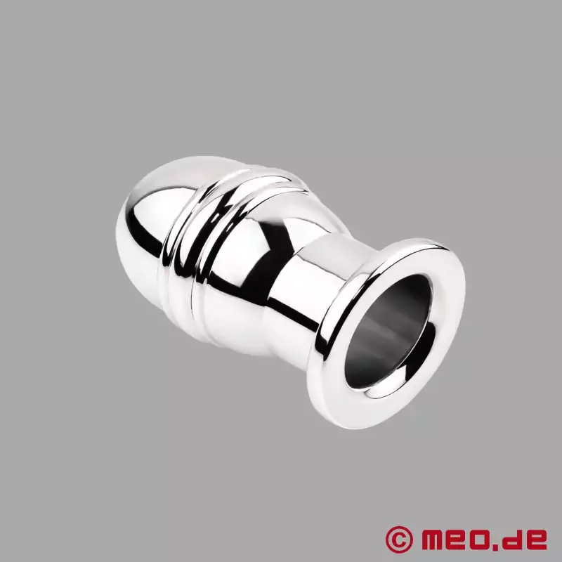 BelleVue™ от MEO® е тунелна анална тапа, изработена от полиран алуминий. Тя държи ануса широко отворен, което позволява много специални прозрения и многообразни приложения. Отворът по цялата дължина, висококачественият материал и трите различни размера превръщат тази butt plug в изключителна секс играчка за анално разширяване и интензивни БДСМ-сесии.
