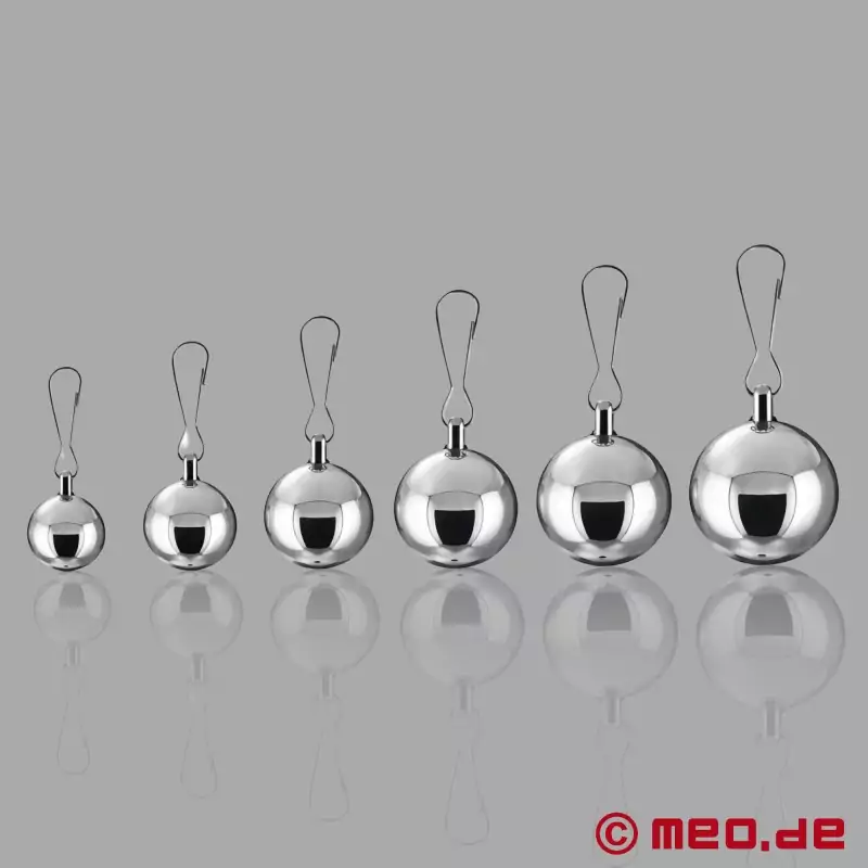 Елегантните тежести за топчета от MEO предават специалната си еротична привлекателност с всяко движение. Топчестите тежести се предлагат в седем размера и нива на тегло. Всички тежести за топки са изработени от неръждаема стомана и са произведени с обичайното високо качество на MEO.