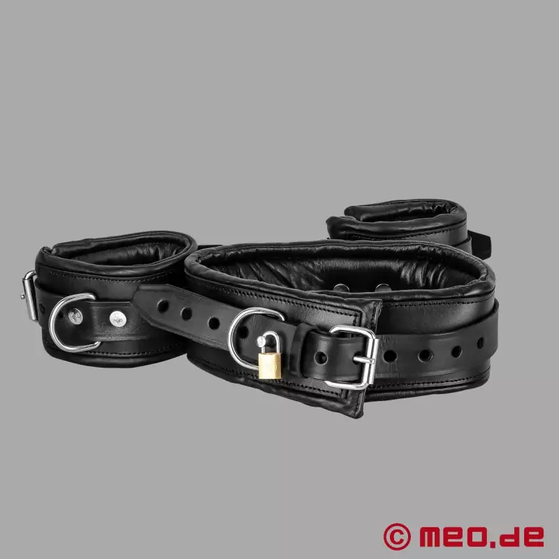 Този комплект за обвързване от MEO® е наистина гениален, защото благодарение на комбинацията от маншети за бедрата със здраво прикрепени окови за глезените, принуждавате Sub да свие краката си и да застане в позиция на колене. Легнал по гръб, той е вързан и "easy fuckable", а легнал по корем в класическа Hogtie позиция, той е безпомощно на ваша милост. След като сте се позабавлявали с партньора си, е време да включите в играта белезниците за ръце. Те са прикрепени с плоска примка, за да се сведе до минимум пространството за маневриране. Белезниците за ръце са прикрепени отстрани на белезниците за бедрата, така че позицията да е удобна, дори когато субът е легнал по гръб.