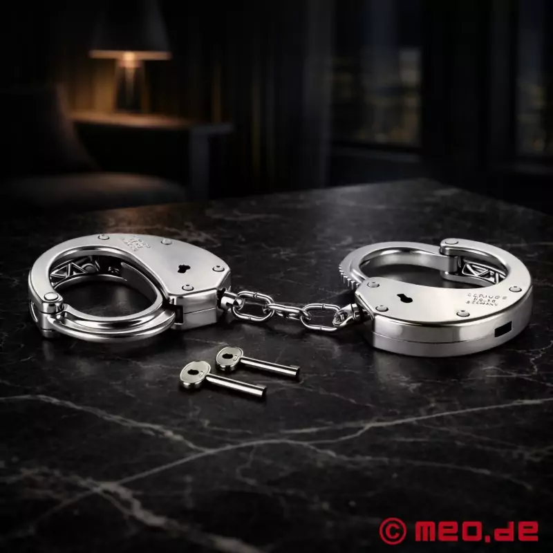 Благодарение на практичния плъзгач за бързо освобождаване е достатъчно само едно натискане на пръста, за да заключите белезниците сигурно и здраво. След като солидната стоманена конструкция се затвори около китките на покорния партньор, здравата свързваща верига от две звена ограничава свободата на движението му дотолкова, че той е напълно беззащитен във ваша власт - без никаква възможност за бягство.
