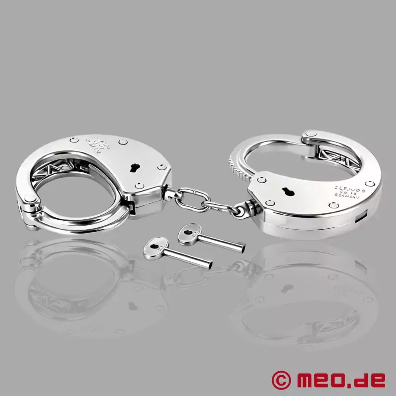 Солидни, тежки и впечатляващи - полицейските белезници № 13 на Clejuso са най-добрият БДСМ аксесоар за всеки, който обича автентичното робство. Произведени в Германия, по-точно в известния град Золинген, тези белезници впечатляват с теглото си от 1000 грама и висококачествената си изработка.