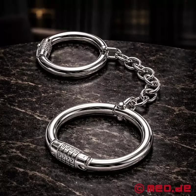 Комбинираната ключалка на стоманените окови за глезените MEO® може да се отвори само с правилния 4-цифрен цифров код за всяко фиксиращо средство. Това ги прави идеални не само за всяка БДСМ-сесия, но и за самостоятелно забавление по време на самообвързване.