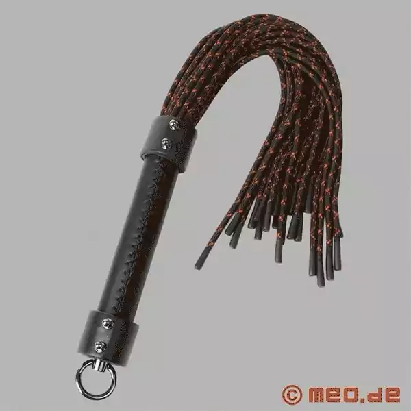 Тънката дръжка с кръстосани шевове приляга сигурно и удобно в ръката, така че да можете да насочвате flogger прецизно дори когато го използвате за по-дълги периоди от време. Черно-червеният вид на нишките поставя ясно доминиращ акцент и е плашещ за окото. В края на дръжката има здрава метална халка, която улеснява окачването на flogger или прикрепянето му към колана.
