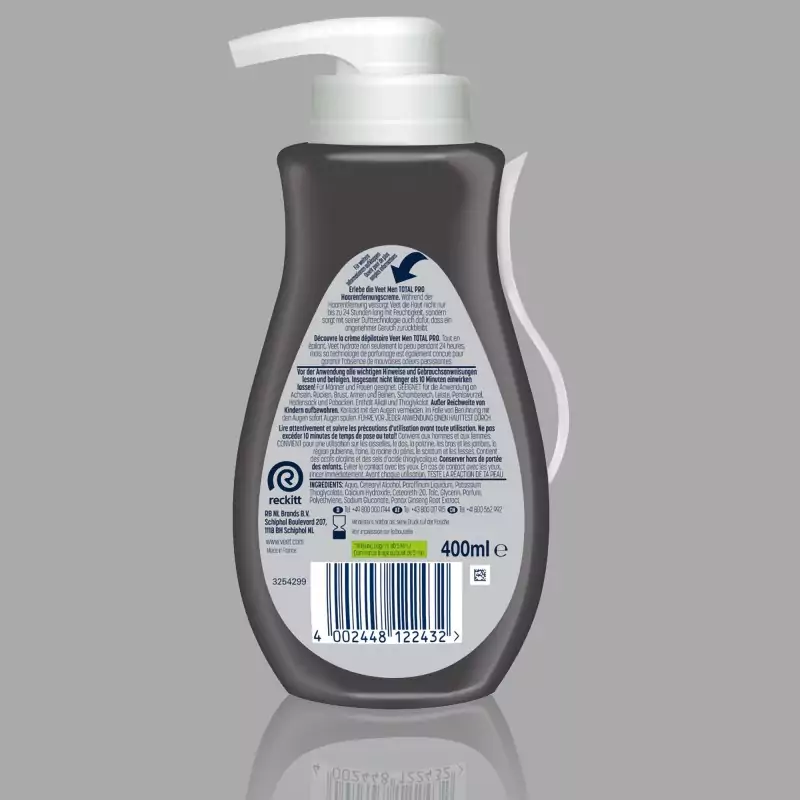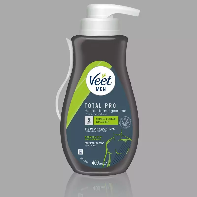 Кремът за обезкосмяване Veet Men Total Pro™ е специално разработен за нуждите на мъжката кожа и се предлага във версия от 400 ml в практичен дозатор. Той премахва нежеланото окосмяване по тялото бързо и ефективно. Кремът осигурява забележимо гладка кожа, овлажнява до 24 часа и позволява обезкосмяване на горната част на тялото и краката без риск от порязване, какъвто може да има при бръснене.