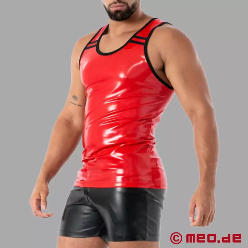 The red Latex Tank Top from the SecondSkin™ collection is impressive latex clothing for a masculine and sexy look. Латексът осигурява типичния високогланцов вид отвън, докато еластичната смес от плат отвътре предлага плътно прилепване. Черните контрастни ръбове и светлоотразителните акценти правят ясно, графично изявление и превръщат Latex Tank Top в идеално клубно облекло, което гарантирано ще завърти главите ви. Разработен и произведен в Париж, Франция.