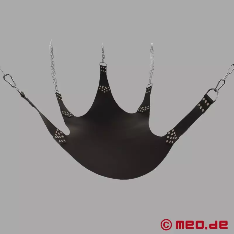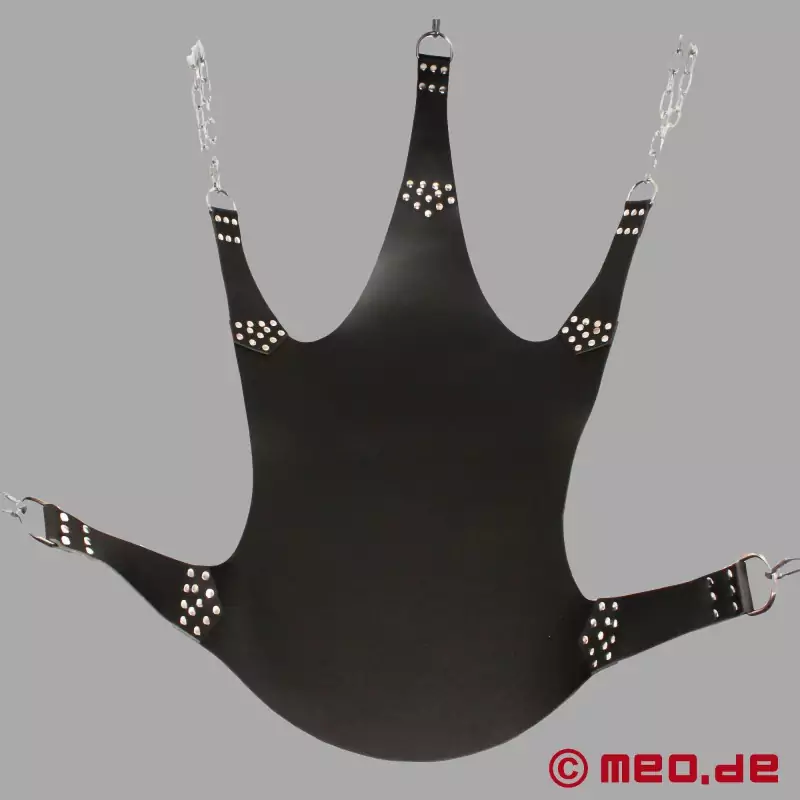 Този класически sling с изтънчени детайли е един от най-популярните ни модели. Висококачественият sling с 5 точки на закрепване е изработен от най-добрата кожа и има здрави D-образните халки за окачване под тавана или в нашата рамка за слинг. Няколкократно занитван с нитове от неръждаема стомана и отлично завършен, за да ви гарантира необходимата безопасност по време на секс в слинга.