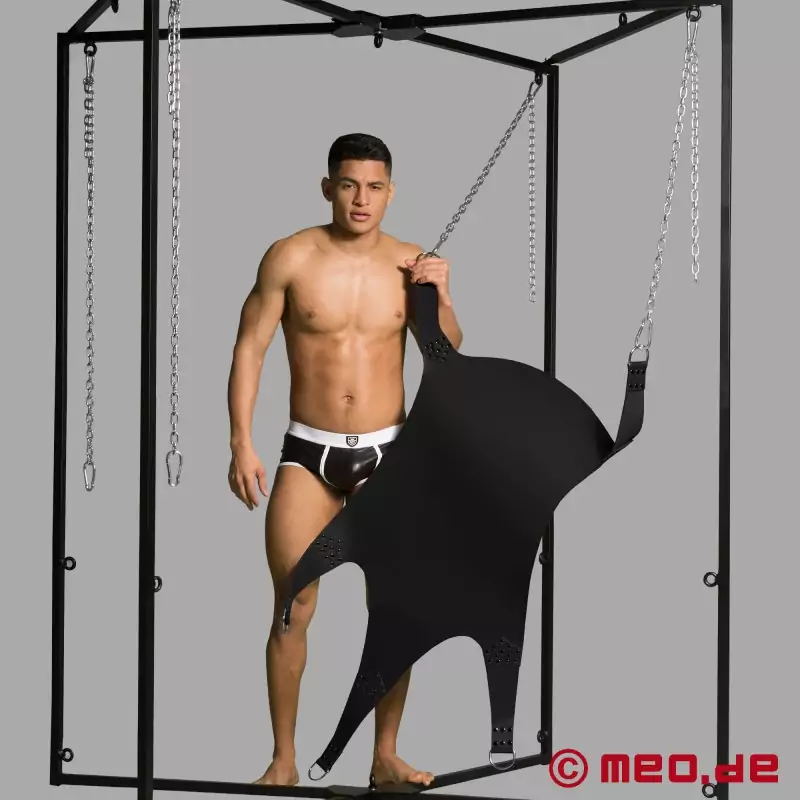 С sling-а от MEO ® можете да се насладите на изключително дълбоко проникване с минимални усилия и да изпробвате нови секс позиции и анален фистинг. The sling can be hung in the sling frame or from the ceiling on sturdy ceiling hooks (not included in the kit) in no time at all. Sling-ът може лесно да се регулира до желаната височина и ъгъл с помощта на карабинери. Перфектен за партньори с различни размери и разнообразни позиции.
