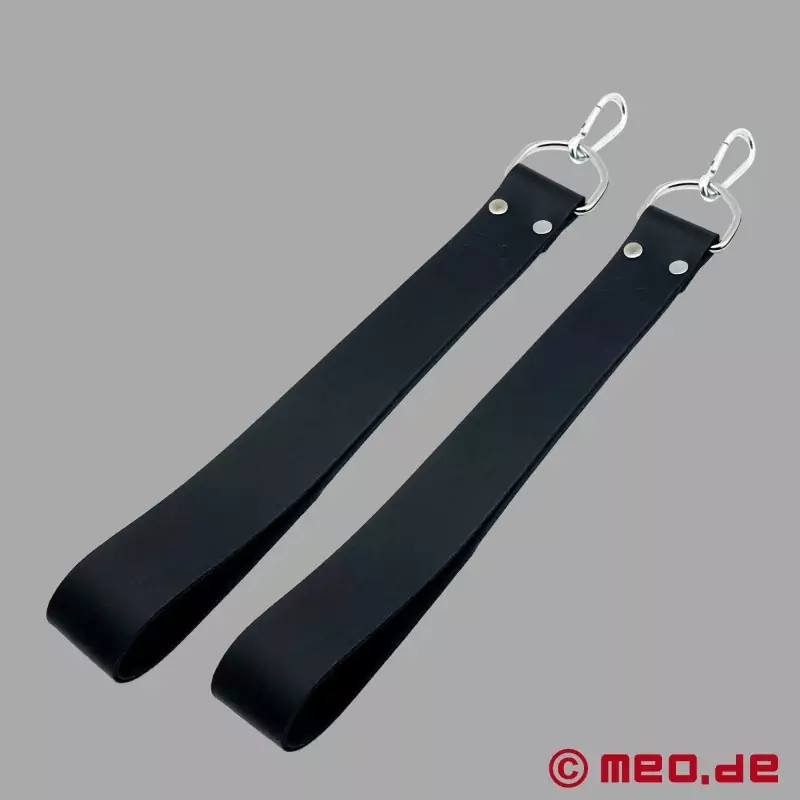 Особено подходящи за практики като чукане с юмрук или наистина твърд секс! Каишките за крака са най-популярният аксесоар за sling. Нашите ремъци за крака са изработени от кравешка кожа и са изключително здрави. Те са идеални за нашите кожени slings, постелки за slings и дъски за slings. Каишките за крака са двойно занитени и издържат на големи натоварвания. Вградените D-пръстени ви позволяват да прикрепите примките за крака към веригите за закрепване на sling-а с помощта на карабинери.