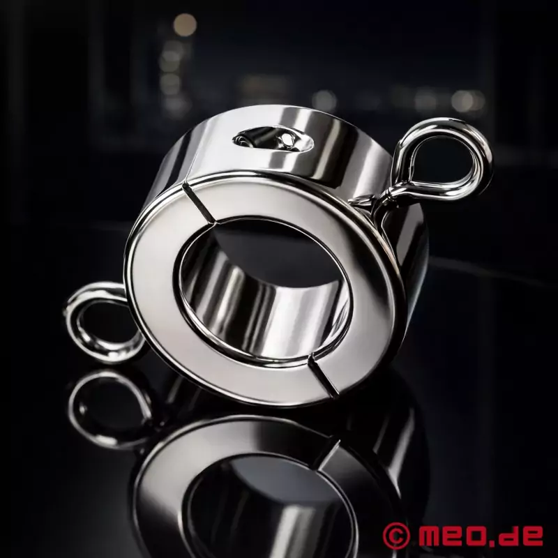 Удължителят за тестиси от неръждаема стомана има двукомпонентен дизайн и може да бъде закрепен сигурно и здраво с вградените шестостенни винтове. Това я прави не само удобна за носене, но и изключително здрава, така че да може да се използва без колебание за по-дълъг период от време, дори по време на интензивни БДСМ-сесии.