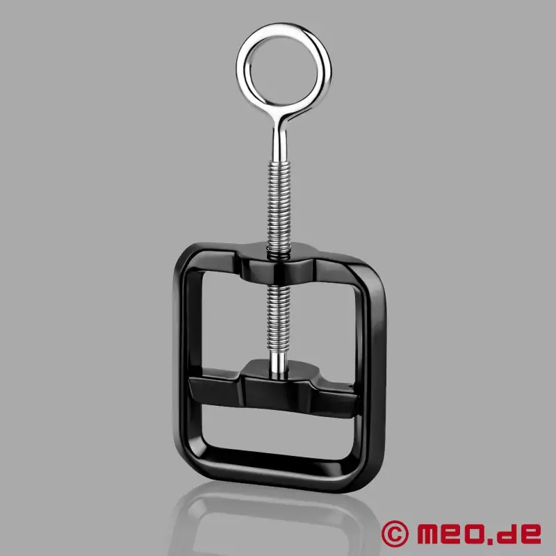 This ball crusher is a simple yet effective device perfect for those that love cock and ball torture. It's just the right tool for ball crushing or weighted ball stretching. Slip your testicles through the gap and use the screw to tighten the clamp just above your balls for a weighted stretch. The simple screw mechanism gives you great control over the intense pressure you can inflict on your testicles but be sure not to cut off circulation! Simply turn the screw mechanism, counter clockwise, to make the bar move inward, applying deep pressure against the balls. Once you've gotten used to the weight of this devious device you can use the loop on the end to hang additional weights or to attach rope. When you're into cock and ball torture then you know full well that the sky is the limit. When you're ready to release them just reverse the direction of the screw.