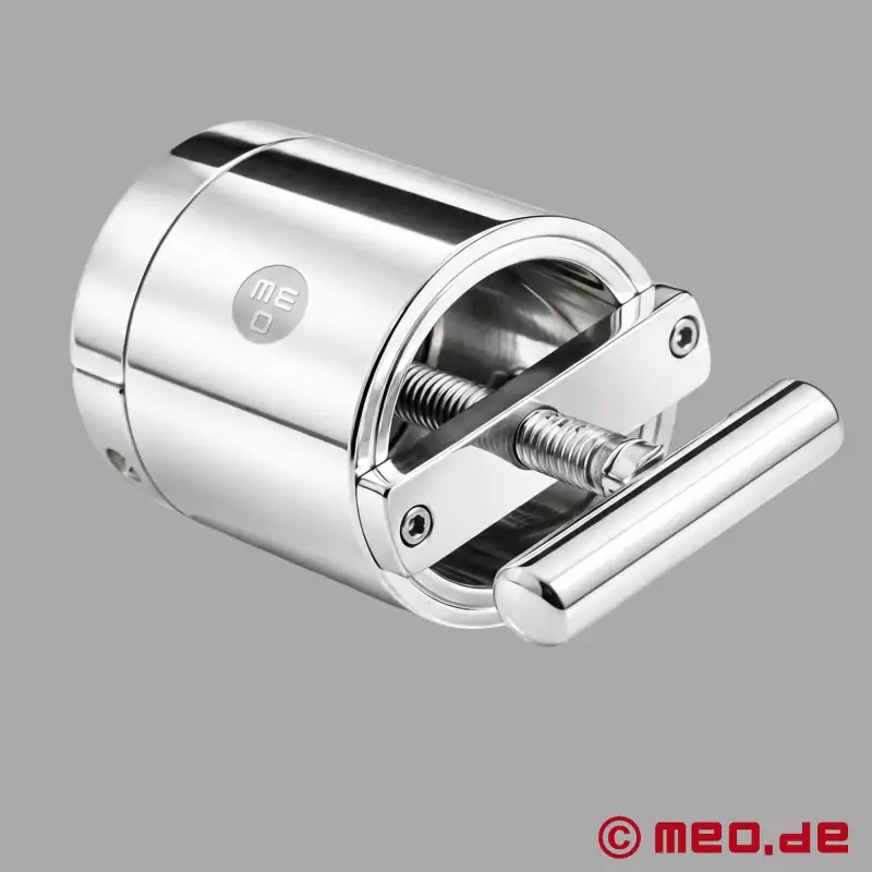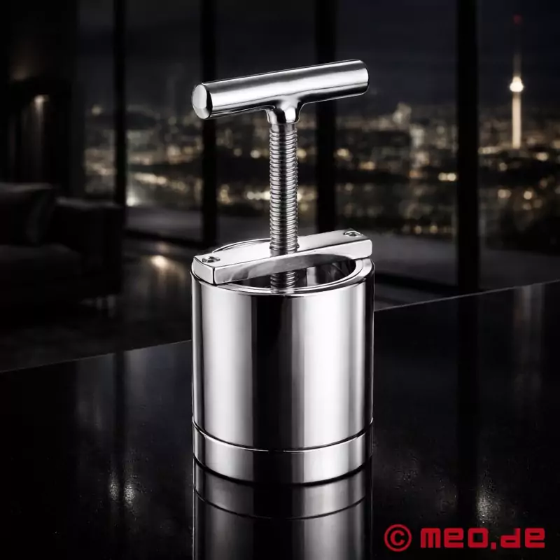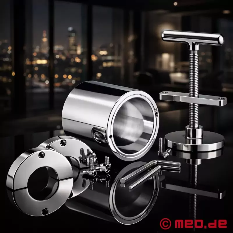 Неговата специална привлекателност се крие в изчистения му, функционален дизайн. Веднага след като се постави удължителят за тестиси и се прикрепи стоманеният цилиндър, се създава затворена система, която позволява много целенасочена и контролирана употреба. Налягането може да се регулира постепенно чрез Т-образната ръкохватка и вградения шпиндел - от много контролирано до значително по-интензивно, в зависимост от опита, предпочитанията и сценария.